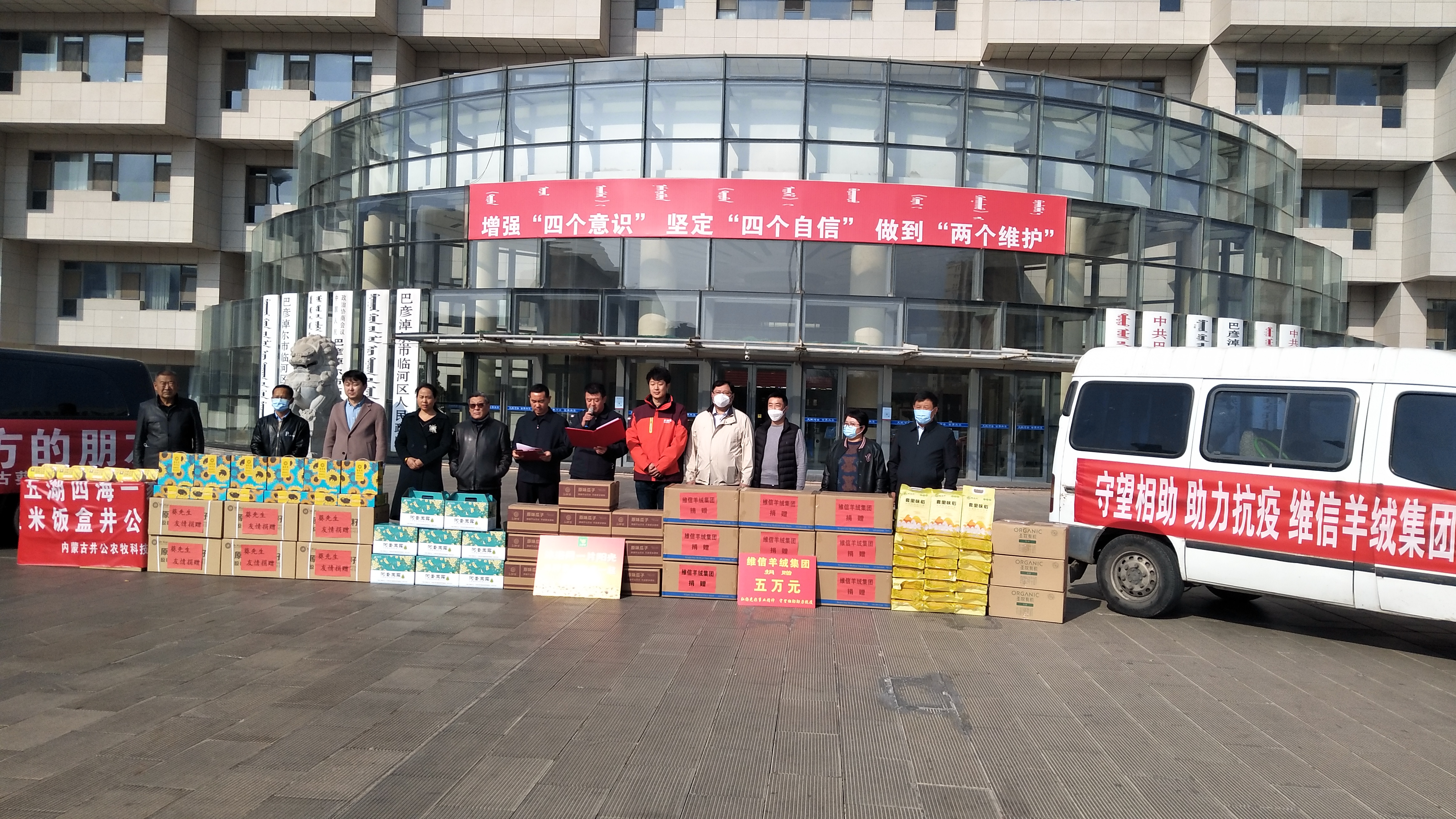 11月5日中午,維信羊絨集團(tuán)等7家會員單位向巴彥淖爾市臨河區(qū)抗疫捐贈物資,捐贈儀式在臨河區(qū)政府辦公樓前舉行,區(qū)委副書記、政法委書記陳海維參加活動并講話,對愛心企業(yè)的高尚情操給與了高度評價,區(qū)政協(xié)副主席劉浩主持了捐贈儀式。