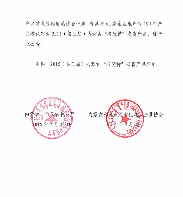 關(guān)于發(fā)布2015年(第三屆)內(nèi)蒙古“名優(yōu)特”農(nóng)畜產(chǎn)品的公告