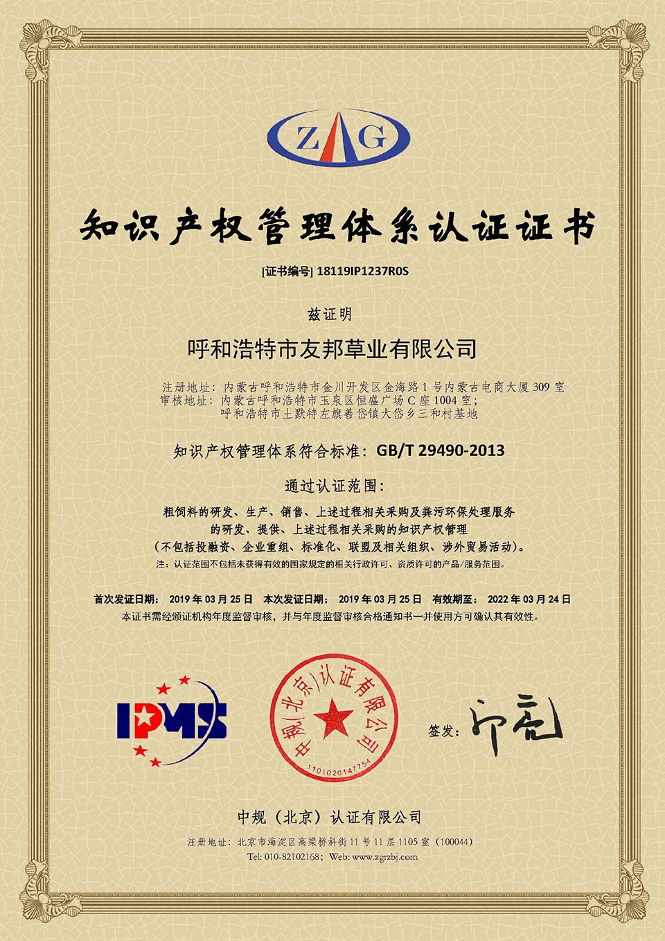 呼和浩特市友邦草業(yè)有限公司于2019年3月25日正式獲得由中規(guī)(北京)認(rèn)證公司頒發(fā)的《知識產(chǎn)權(quán)管理體系認(rèn)證證書》(證書編號:18119IP1237R0S),這標(biāo)志著友邦草業(yè)在知識產(chǎn)權(quán)創(chuàng)造、運用、管理和保護(hù)方面全面邁入國內(nèi)領(lǐng)先水平。
