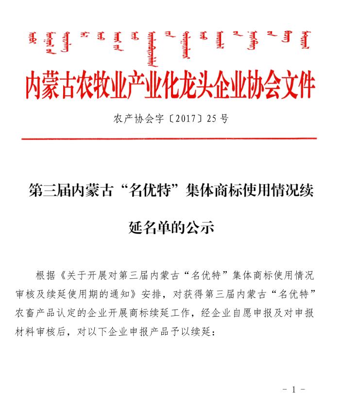 第三屆內(nèi)蒙古“名優(yōu)特”集體商標(biāo)使用情況續(xù)延名單的公示
