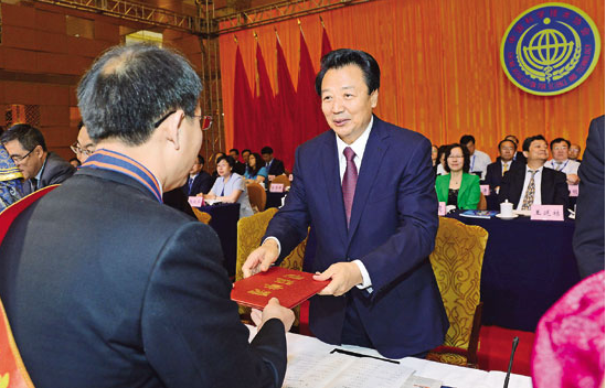 5月29日上午,自治區(qū)黨委書記王君在自治區(qū)科協(xié)第七次代表大會上,為榮獲“第九屆內(nèi)蒙古自治區(qū)青年科技獎”和“首屆內(nèi)蒙古自治區(qū)科技標(biāo)兵”稱號的代表頒獎。記者袁永紅攝
